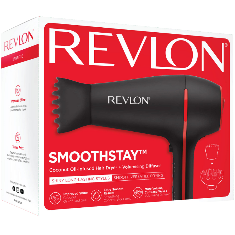 Opnå et silkeblødt og glansfuldt resultat med Revlon Smoothstay hårtørrer. Den er beriget med en unik kokosolie-infusion, som plejer dit hår under tørring og efterlader det mærkbart blødt og skinnende.