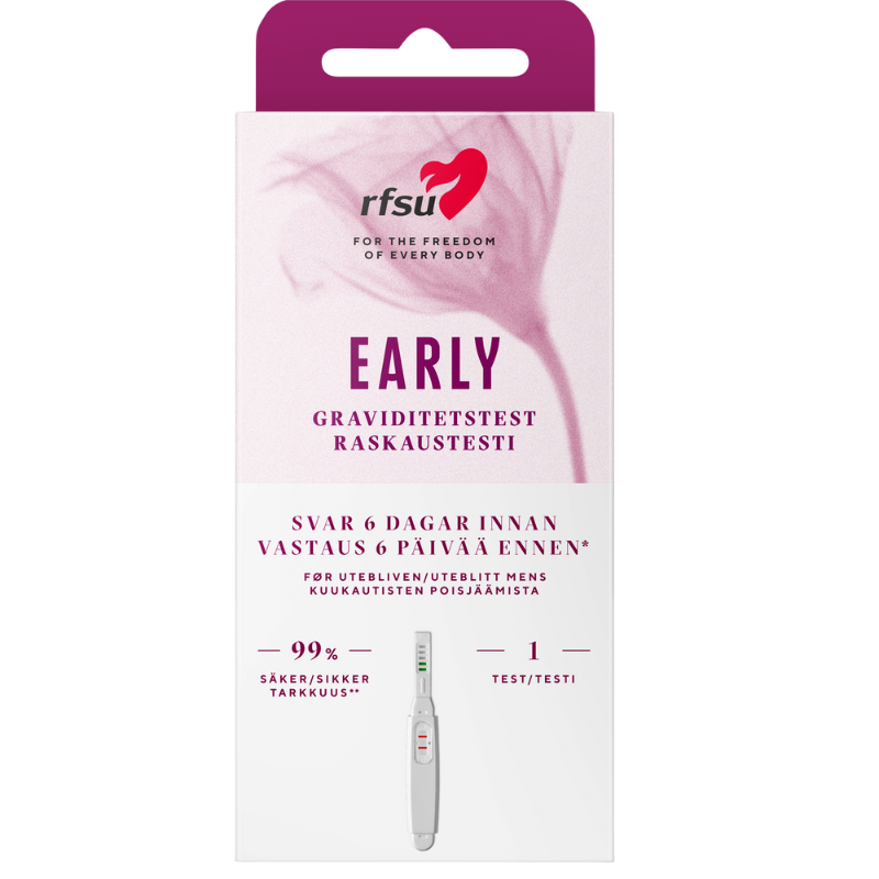 "Opbevares utilgængeligt for børm. RFSU Test Tidlig adskiller sig fra andre graviditetstest på det danske marked, da testen allerede kan tages 6 dage inden forventet menstruation"