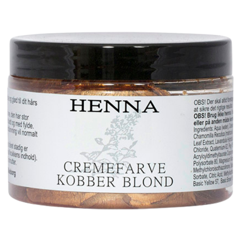 HENNA CREMEFARVE - KOBBER Henna cremefarve giver ekstra dybde og glød til dit hårs naturlige farve. Henna cremefarve er ikke kun en farve, den har stor balsam effetkt, som efterlader håret blødt og med fylde. Efter hårvask, mens håret stadig er fugtigt, fordeles farven,ca.halvdelen af krukkens indhold i håret. Lad farven virke i minimum 10 min. og max. 45 min. hvorefter det skylles.