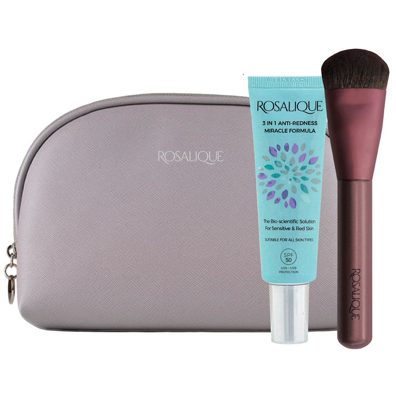 Toilettaske med Rosalique 3 i 1 Anti-Redness Miracle Formula SPF50 30, Rosalique Miracle Brush & Rosalique Luxury Makeup Bag.