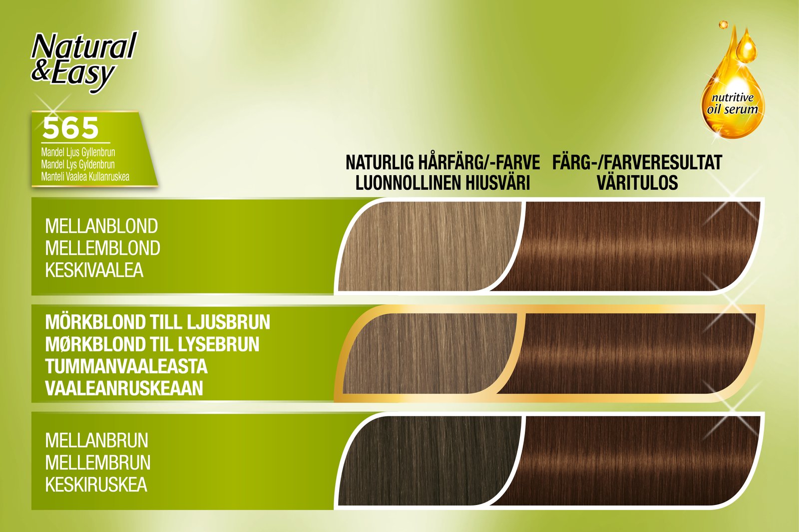 Opnå en smuk og naturlig hårfarve med Schwarzkopf Natural & Easy 565 Almond Light Goldbrown. Denne hårfarve giver dig en levende, mandel lys gyldenbrun nuance med et glansfuldt resultat.