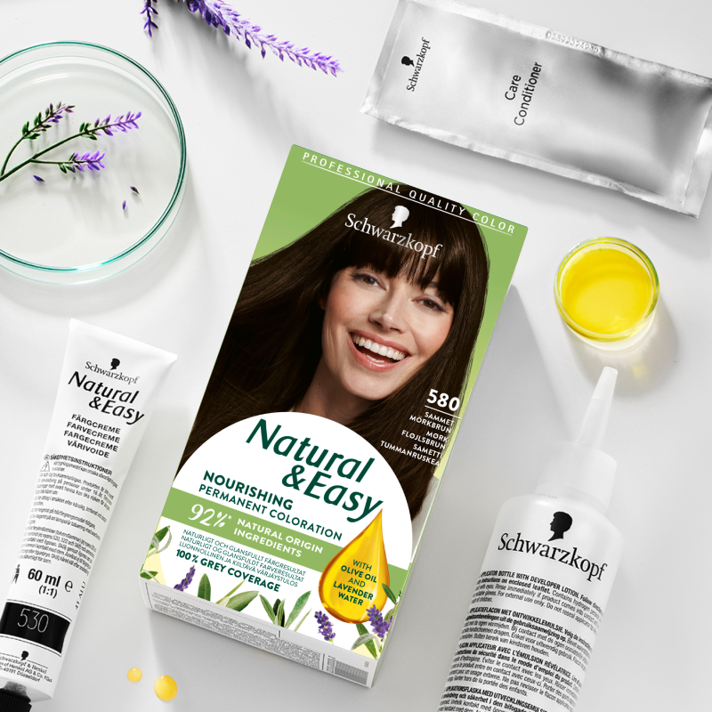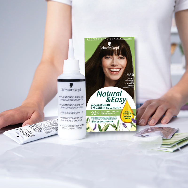 Med Schwarzkopf Natural & Easy 580 Velvet Darkbrown kan du nemt og trygt opfriske din hårfarve. Få en smuk, dyb mørkebrun farve med et naturligt udseende. En pålidelig løsning til en vellykket og flot hjemmefarvning hver gang.
