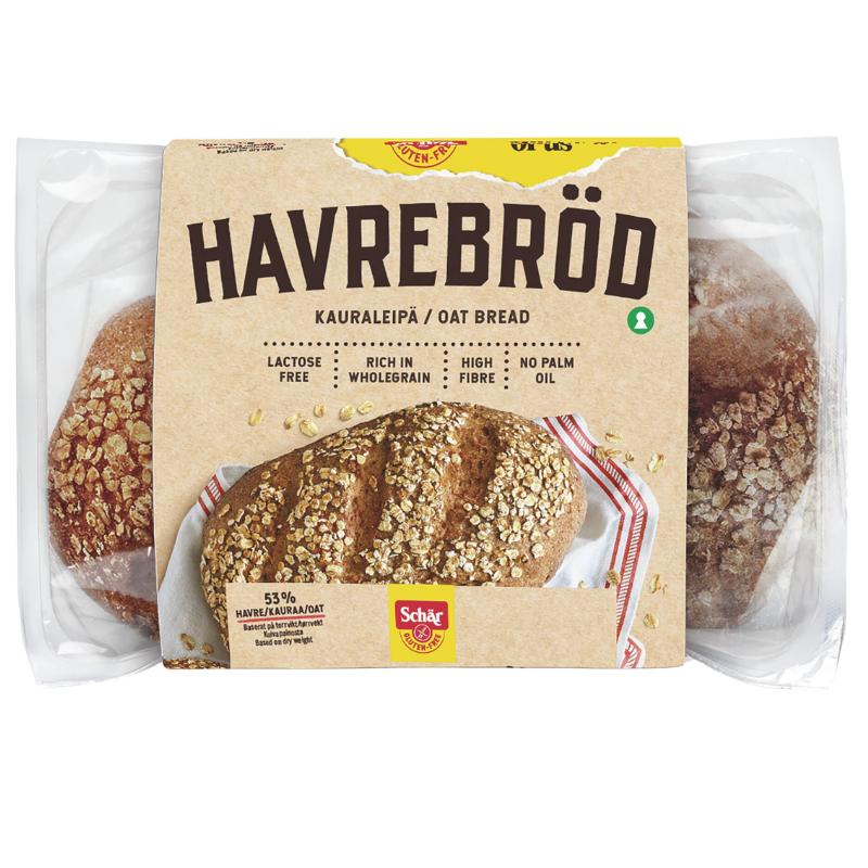 Samme indhold og smag som før, men nu i varemærket Schär. Havrebrød fra Schär er et glutenfrit fuldkornsbrød med havretopping som minder om et håndværksbrød. Brødet er ikke bare glutenfrit men også rigt på fuldkorn, Nøglehulsmærket og laktosefrit – et dejligt alternativ, som flere kan få glæde af. Brødet er rigt på fuldkorn, har højt fiberindhold og er Nøglehulsmærket. Havrebrød er fri for palmeolie.