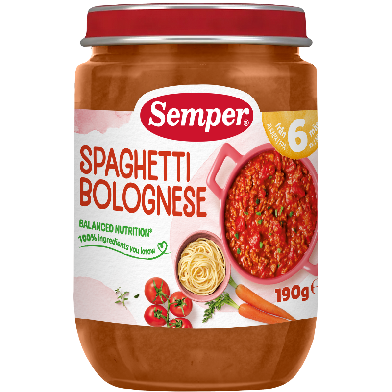 Giv din baby en lækker start på mad-eventyret med Semper Spaghetti Bolognese. En nærende og velsmagende klassiker, tilpasset de små fra 6 måneder, som gør måltidet nemt og bekvemt i en travl hverdag.