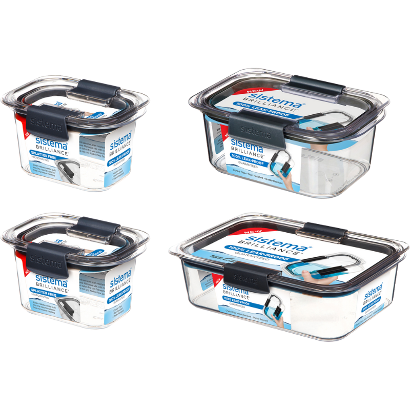 Sistema® Brilliance™ opbevaringsserie er perfekt til opbevaring af fødevarer som eks. kød, grøntsager og frugt, så du bevarer overblikket i dit køleskab. De krystalklare bunde og låg giver dig rig mulighed for at se indholdet. Brilliance er 100% lækagesikre, så du sikkert kan transportere dine madvarer, som eks. supper, saucer og gryderetter. Under klipsene er der ventilationsåbninger, som sikrer stænkfri opvarmning i mikroovn. Den pletbestandige konstruktion bevarer et pletfrit udseende, så du nemt kan sætte dine Brilliance direkte på bordet. Dette produkt kan stables, kan bruges til opbevaring af tørre ingredienser i dit skab eller skuffer, fødevarer i køleskabet eller i din fryser. Endvidere er produktet sikkert at bruge i opvaskemaskinen (i øverste kurv) samt mikroovnen med åbne klips, så ventilerne åbnes. Ved brug i mikroovn bør der omrøres jævnligt, især ved højt indhold af olie og fedt. Phthalat & BPA fri.