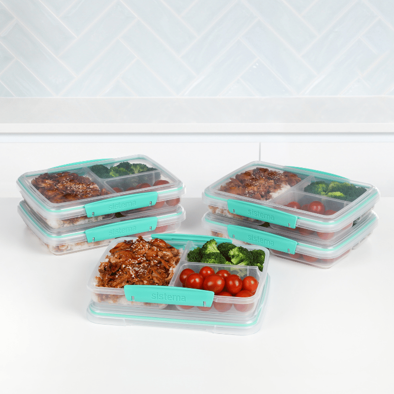 Denne 5 pack indeholder 5 stk. Multi Split To Go fra sistema, som er perfekte til rester efter aftensmaden, meal prep, til snacks til skovturen og meget andet. De smarte, rektangulære beholdere sikrer den mest effektive udnyttelse af pladsen i dit køleskab, fryser og køkkenskuffe. Sistemas® patenterede nemme låseclips og fleksible forsegling sikrer, at maden forbliver frisk i længere tid. Multi Split giver dig mulighed for at opbevare tre forskellige slags indhold i én beholder, nemt og overskueligt. Ideel til nedfrysning af tilberedt mad, mos, grød osv. Eller til agurkestænger, tomater og vindruer til frokosten. Designet i gennemsigtigt plast, som giver dig mulighed for hurtigt at se, hvad der er i boksene. Klips i farverne Minty Teal. Dette produkt kan stables, kan bruges til opbevaring af tørre ingredienser i dit skab eller skuffer, fødevarer i køleskabet eller i din fryser. Endvidere er produktet sikkert at bruge i opvaskemaskinen (i øverste kurv) samt mikroovnen (uden låg). Phthalat & BPA fri.Andre informationer
