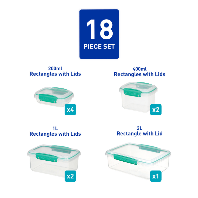 Denne smarte sampak fra sistema indeholder følgende: 1 x 2 L Klip It, 2 x 1 L Klip It, 2 x 400ml Klip It, 4 x 400ml Klip It.
