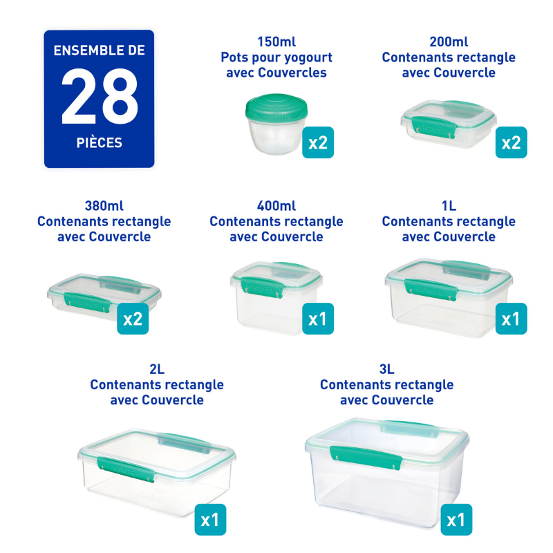 Dette smarte opbevaringssæt fra sistema indeholder følgende: 1 x 3 L Klip It, 1 x 2 L Klip It, 4 x 1 L Klip It, 2 x 400ml Klip It, 2 x 380ml Klip It, 2 x 200ml Klip It, 2 x150ml med skruelåg.