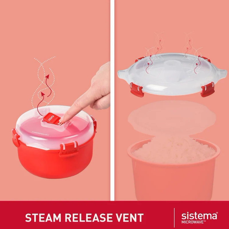 Smart kombipakke i Microwave fra sistema. 1 stk. Rice Steamer Microwave fra sistema gør det nemt at koge ris på få minutter - tilsæt blot ris og vand! Tilsæt blot ris og vand, luk de unikke, letlåsende klips fra sistema og kog. Rice Steamer har en unik trykkammerplade for at sikre, at risene forbliver fugtige, og har små tapper på siden, så Rice Steameren nemt kan løftes ud af mikroovnen. Indeholder en non-stick risske samt en lille vejledning, som fortæller, hvordan man anvender produktet. 1 stk. Round Microwave fra sistema er perfekt til opbevaring og opvarmning af madrester. Tilsæt dine ingredienser, luk de unikke, letlåsende klips fra sistema, åbn dampventilen, og kog eller opvarm igen. Dampventilen sikrer, at din mikroovn holdes fri for madstænk. sistemas® unikke og holdbare Microwave serie er designet til at hjælpe med at gøre tilberedningen af dine måltider hurtigere og nemmere. Med sistemas Microwave serie er der mange muligheder for praktisk opbevaring og opvarmning af din mad, - enten hjemme eller på job/skole. Alle produkter tåler fryser, opvaskemaskine og selvfølgelig mikroovn. 100% fri for BPA, Phthalater og andre skadelige stoffer. Fås i farven rød.Andre informationer