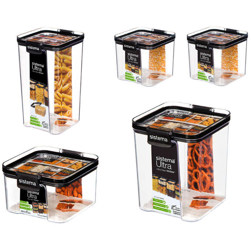 Kassen indeholder følgende størrelser: 1 stk. varenr. 51400: 460ml, 2 stk. varenr. 51401: 700ml, 1 stk. varenr. 51402: 920ml, 1 stk. varenr. 51403: 1,3L. Ultra er en elegant opbevaringsserie i tritan plast fra Sistema. Ultra er en serie af krystalklare, glaslignende opbevaringsbeholdere i en meget slidstærk og brudsikker form, som er både stabelbar, pladsbesparende og effektiv for din køkkenorganisation. Med Sistemas nemme, tætsluttende låseclips og lufttætte forsegling, der holder indholdet frisk i længere tid. Ultra serien med det elegante design passer perfekt til at stå fremme i køkkenet, men er også særdeles velegnet til både skuffer og skabe. Opbevar nemt pasta, havregryn, mel, sukker, nødder og meget andet nemt og elegant. Boksene er nemlig udført i et flot design med et sort og klart låg, som gør det nemt at se, hvad boksene indeholder. Tåler opvaskemaskine (i øverste kurv). Phthalat-fri og BPA-fri.