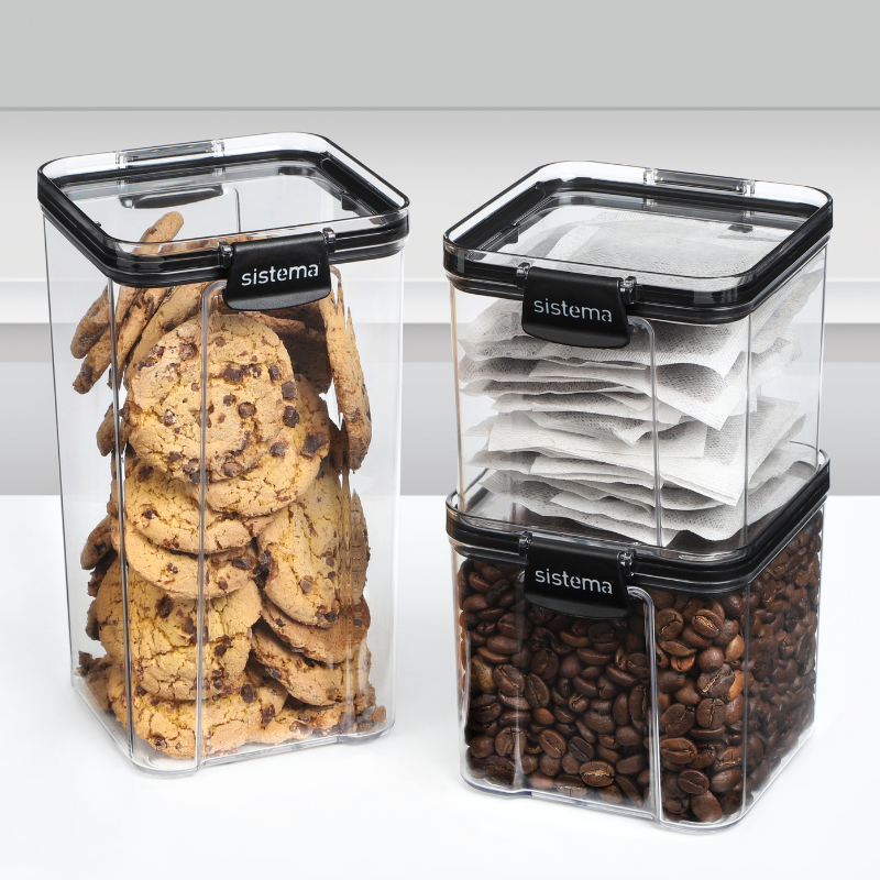 Ultra Pantry 3 pack fra sistema er en fin sampak med to af de populære størrelser i den elegante opbevaringsserie i tritan plast fra sistema® Ultra™. Ultra er en serie af krystalklare, glaslignende opbevaringsbeholdere i en meget slidstærk og brudsikker form, som er både stabelbar, pladsbesparende og effektiv for din køkkenorganisation. Med sistemas nemme, tætsluttende låseclips og lufttætte forsegling, der holder indholdet frisk i længere tid. Ultra serien med det elegante design passer perfekt til at stå fremme i køkkenet, men er også særdeles velegnet til både skuffer og skabe. Opbevar nemt pasta, havregryn, mel, sukker, nødder og meget andet nemt og elegant. Boksene er nemlig udført i et flot design med et sort og klart låg, som gør det nemt at se, hvad boksene indeholder. Tåler opvaskemaskine (i øverste kurv). Phthalat-fri og BPA-fri. Sættet indeholder: 2 stk 700ml og 1 stk 1,3L.