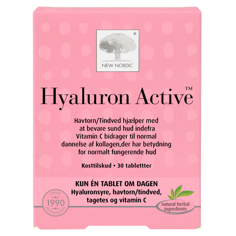 Kosttilskud. Skin Care Hyaluron Active tabletterne er baseret på hyaluronsyre, værdifulde urteekstrakter samt vitamin C. Produktet indeholder en balanceret sammensætning af ingredienser, herunder hyaluronsyre, havtorn og tagetes, hvoraf tagetes naturligt indeholder lutein. Vitamin C bidrager til normal dannelse af kollagen, der har betydning for normalt fungerende hud. Kollagen er en vigtig strukturel komponent i huden, herunder bindevæv. Daglig dosis: Voksne og børn fra 11 år: 1 tablet daglig.