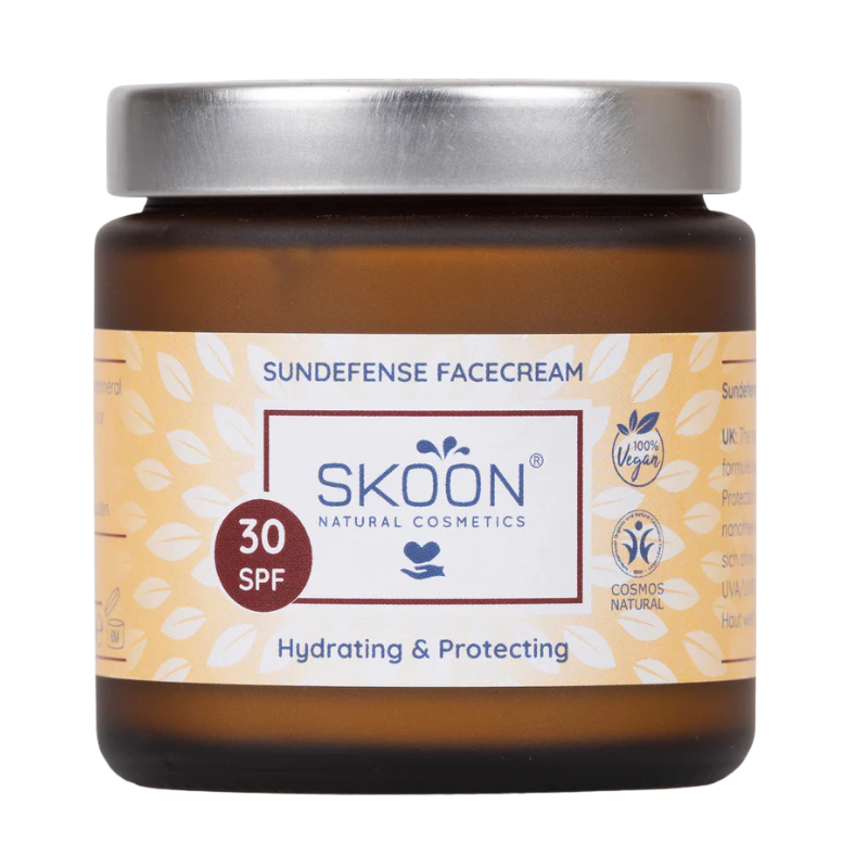 Beskyt din hud med Skoon Sundefense Facecream SPF 30. Denne ansigtscreme er baseret på naturlige og økologiske ingredienser og er rig på gode olier, der plejer din hud, mens den effektivt beskytter mod solens stråler.