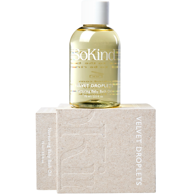 Velvet Droplets er en beroligende baby badeolie, der ikke fedter, og som er skabt til at nære babys sensitive hud. Badeolien består af økologiske og naturlige olier fra havre, som genopretter hudens naturlige barriere og efterlader huden blød. Velvet Droplets er formuleret og produceret i Danmark og leveres i bæredygtigt emballage. Fri for farve, alkohol og parfume. Alle SoKind produkter er veganske, Allergy Certified og er ikke testet på dyr.Ingredienser