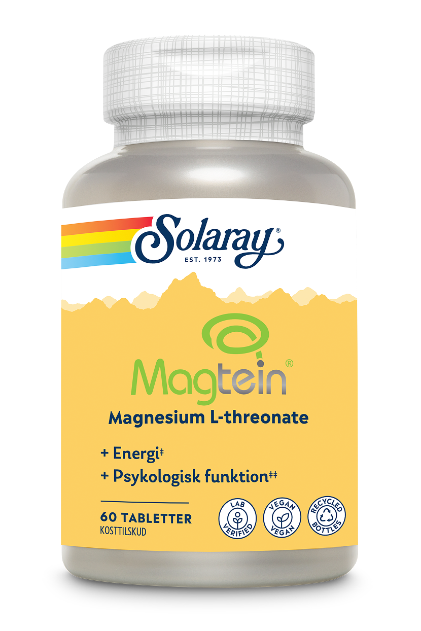 Solaray Magtein® Magnesium L-threonate er et innovativt kosttilskud, der indeholder magnesium bundet til L-threonat – en særlig form for magnesium, som er udviklet for at sikre god optagelighed i kroppen. Magnesium bidrager til at mindske træthed og udmattelse, understøtter et normalt energistofskifte, hjælper med at vedligeholde en normal muskelfunktion samt bidrager til nervesystemets normale funktion og en normal psykologisk funktion.