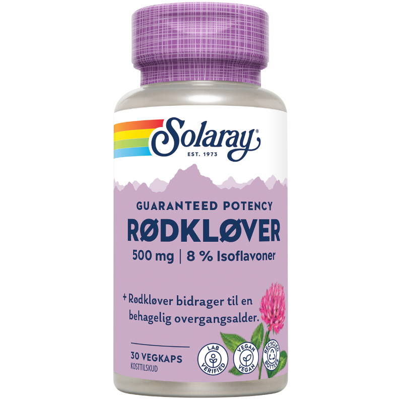 Solaray Rødkløver indeholder en kombination af Rødkløver ekstrakt fra de overjordiske dele og Rødkløver blomst. Rødkløverekstraktet er et standardiseret ekstrakt med et indhold af 40 mg Isoflavoner pr. kapsel.