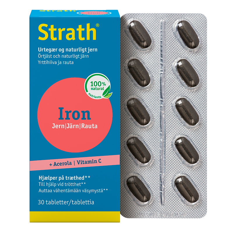 Strath Iron indeholder naturlige ingredienser. De er lavet af en kombination af naturligt fermenteret jern fra koji-svamp og fermenteret urtegær samt naturligt vitamin C fra acerolakirsebær.
