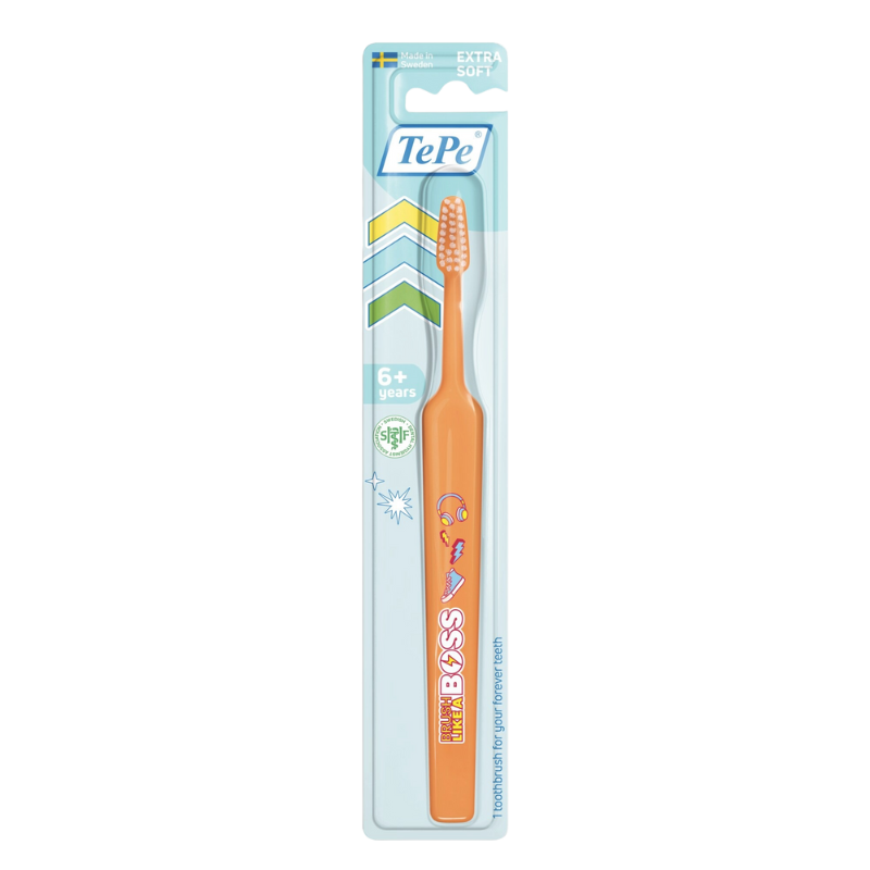 Brug tandbørsten to gange om dagen, morgen og aften, sammen med tandpasta for at opretholde god mundhygiejne. Børn skal hjælpes af en voksen. TePe Kids er en tandbørste til børn fra 6 år.