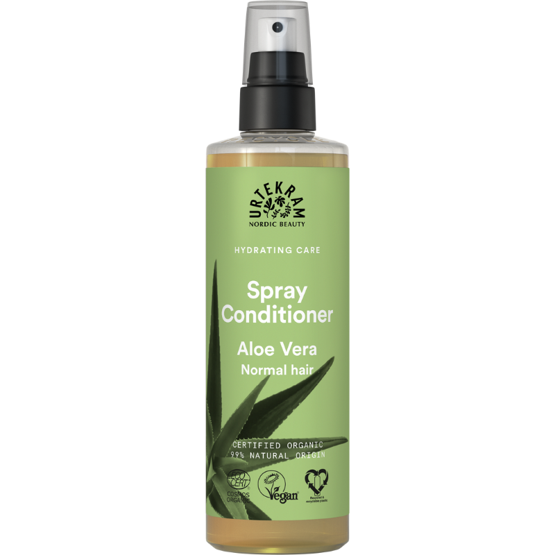 Urtekram Aloe Vera Spray Conditioner med hydroliseret majsstivelse og rødbede ekstrakt forbedrer balsameffekten og beskytter mod varme, stress og misfarvning. Kan anvendes til alle hårtyper.