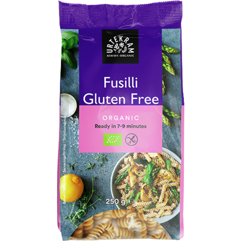 Glutenfri Fusilli Pasta fra Urtekram. Den er lavet af økologisk fuldkornsrismel fra Italien, som jo er pastaens hjemland.