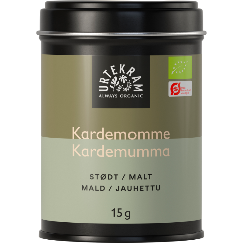 Økologisk stødt kardemomme Grøn kardemomme er et af verdens ældste og mest eftertragtede krydderier. Har en varm og frisk smag med strejf af eukalyptus og citrus. Håndpakket på Urtekrams eget Urteri i Mariager.