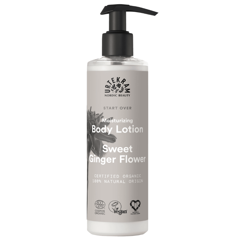 Urtekram Start Over Sweet Ginger Flower Body Lotion med duft af sød ingefærblomst forkæler din hud med fugtgivende aloe vera, hyaluronsyre, sheasmør, glycerin og naturlige olier, som giver en langvarig silkeblød fornemmelse.