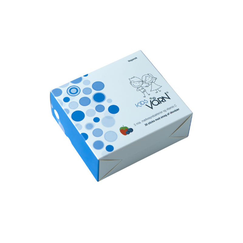 KidsVärn® stick er nem at indtage. Mælkesyrebakterier indeholdende C-vitamin med smag af skovbær tilfører familiens børn både lactobacillus og bifidobakterier til deres tyndtarm og tyktarm.