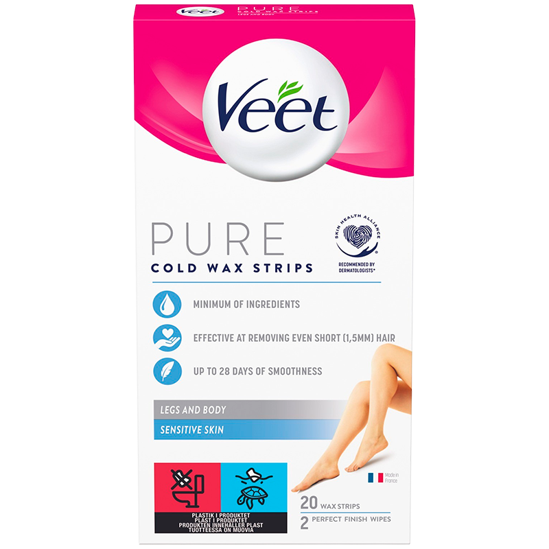 Opnå langvarig glathed med Veet Pure Cold Wax Strips til ben og krop. Disse brugervenlige voksstrips fjerner effektivt selv korte hår fra roden, så du kan nyde silkeblød hud i op til flere uger.
