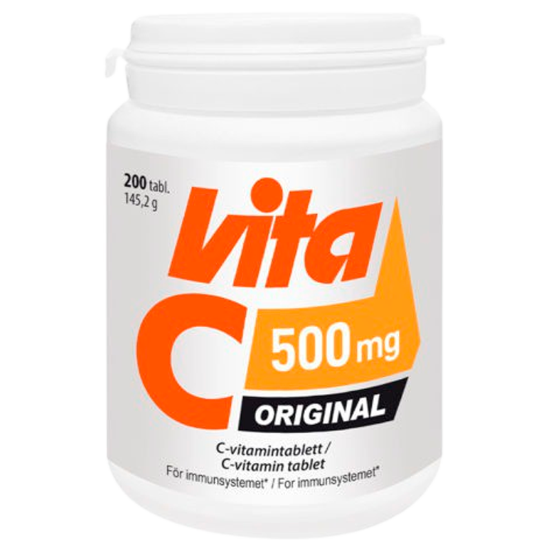 Vita C C-vitamintablet (200 tab) er et vitamin C kosttilskud, der kommer i form af tabletter. Dette kosttilskud er formuleret med 500 mg vitamin C pr tablet. Vitamin C er et vandopløseligt vitamin, der blandt andet bidrager til normal dannelse af kollagen, immunsystemets normale funktion og et normalt energistofskifte, men vitaminet opbavares ikke godt i kroppen over længere tid, og bør dermed indtages ofte.