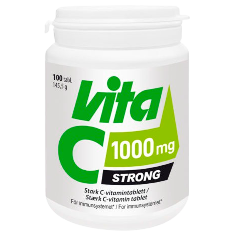 Vita C Stærk C-vitamintablet (100 tab) er et koncentreret vitamin C kosttilskud, der kommer i form af tabletter. Dette kosttilskud er formuleret med 1000 mg vitamin C pr tablet. Vitamin C er et vandopløseligt vitamin, der blandt andet bidrager til normal dannelse af kollagen, immunsystemets normale funktion og et normalt energistofskifte, men vitaminet opbavares ikke godt i kroppen over længere tid, og bør dermed indtages ofte.