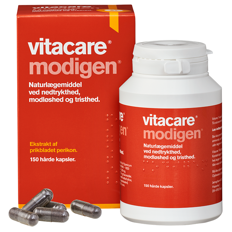 Vitacare Modigen, hårde kapsler. Ekstrakt af prikbladet perikon (Hypericum perforatum L., herba). Virkning: Naturlægemiddel ved nedtrykthed, modløshed og tristhed. Dosering: Voksne: 1 kapsel 2-3 gange dagligt. Bør ikke anvendes til børn under 12 år uden lægens anvisning. Advarsler og forsigtighedsregler: Må ikke anvendes v. allergi overfor perikon el. et hjælpestof. Tal med din læge el. apotekspersonalet, før du tager Vitacare Modigen hvis du har, eller har haft, en bipolar lidelse (skiftende perioder m. opstemthed/overaktivitet og nedsat sindsstemning), hvis du tager anden medicin, har øget lysfølsomhed el. nedsat lever- el. nyrefunktion. Undgå solbadning under behandlingen, hvis du har lys hud. Vitacare Modigen indeholder maltodextrin. Kontakt lægen, før du tager Vitacare Modigen, hvis lægen har fortalt dig, at du ikke tåler visse sukkerarter. Du må ikke tage Vitacare Modigen, hvis du tager: Blodfortyndende medicin, medicin v. HIV, medicin efter organtransplantation og mod alvorlige sygdomme, der påvirker immunsystemet (ciclosporin, tacrolimus). Du bør undgå behandling med Vitacare Modigen, hvis du tager: Medicin mod hjertesygdom (digoxin, ivabradin, calciumantagonister, fx verapamil), p-piller, methadon, medicin mod epilepsi (carbamazepin, phenobarbital, phenytoin), theophyllin (mod astma), medicin mod svampeinfektion (voriconazol), medicin v. kræftsygdom (imatinib, irinotecan). Du skal udvise forsigtighed, hvis du tager medicin mod: mavesår (syrepumpehæmmere), forhøjet kolesterol (statiner), migræne (fx sumatriptan), depression, ADHD (fx methylphenidat) eller medicin til bedøvelse (midazolam). Du skal være forsigtig, hvis du i forvejen tager medicin, der øger lysfølsomheden. Graviditet og amning: Sikkerhed ifm. graviditet og amning er ukendt. Vitacare Modigen bør derfor ikke anvendes. Bivirkninger: Almindelige: Hudkløe og -rødme pga. øget lysoverfølsomhed (især hos personer m. lys hud). Sjældne: Gener fra mave-tarmkanalen inkl. mavesmerter. Meget sjældne: Allergiske hudreaktioner, træthed, rastløshed. Pakninger: 60 og 150 stk.