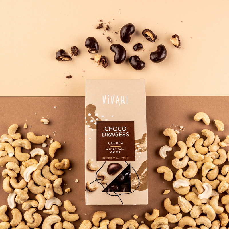 Den fineste økologiske mørke chokolade med et kakaoindhold på 53% bruges til VIVANI Choco Dragées-serien. Cashew-varianten indeholder friskristede cashewnødder. Chokoladeindholdet i de fine kugler er 74%.