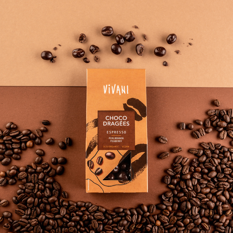 Den fineste økologiske mørke chokolade med et kakaoindhold på 53% er brugt til VIVANI Choco Dragées-serien. Espressovarianten indeholder friskristede peaberry-kaffebønner. Disse sjældne kaffebønner vokser enkeltvis i kaffekirsebærret og udvikler derfor en særlig intens smag. De håndplukkede og -sorterede 'peaberries' kommer fra Mexico. De er blevet forædlet i en særlig ristningsproces, som betyder, at bønnerne ikke smuldrer, når man tygger på dem, men knaser i stedet blidt.