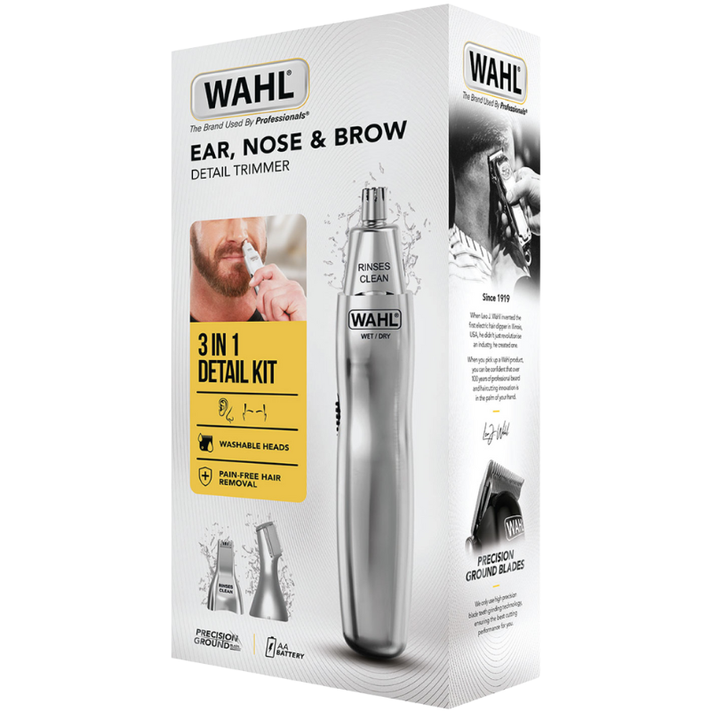 Hold din personlige pleje ved lige med dette alsidige 3-i-1 detaljetrimmersæt fra WAHL. Perfekt til præcis og skånsom trimning af hår i næse og ører, så du altid kan fremstå velplejet og soigneret.