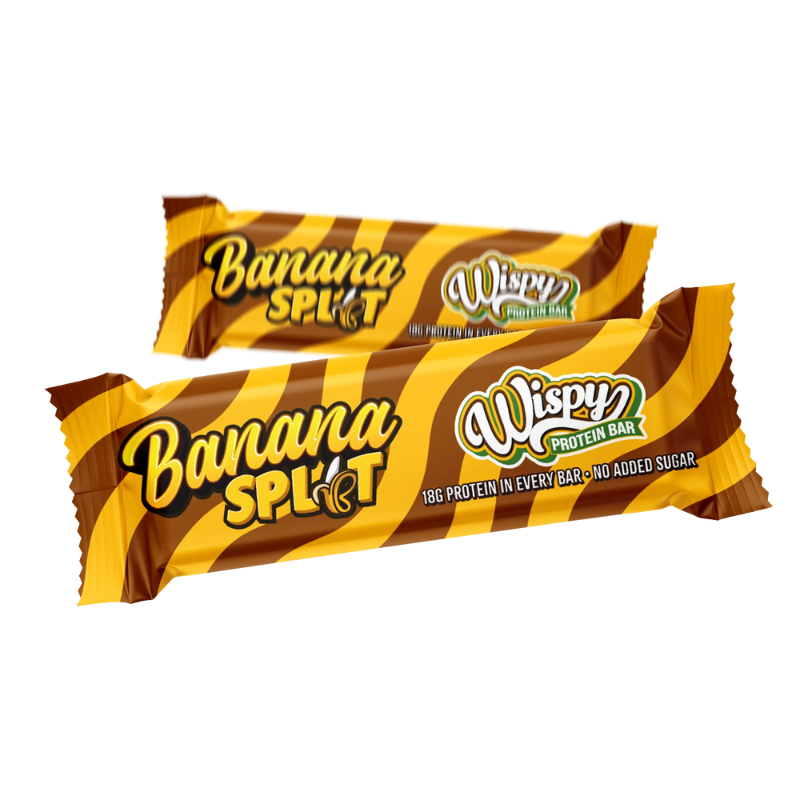 Få en lækker og proteinrig snack med Wispy Proteinbar Banana Split. Denne danskproducerede bar er uden tilsat sukker og kaloriefattig, perfekt til at stille sulten og støtte din træning med en uovertruffen smag af banan split.